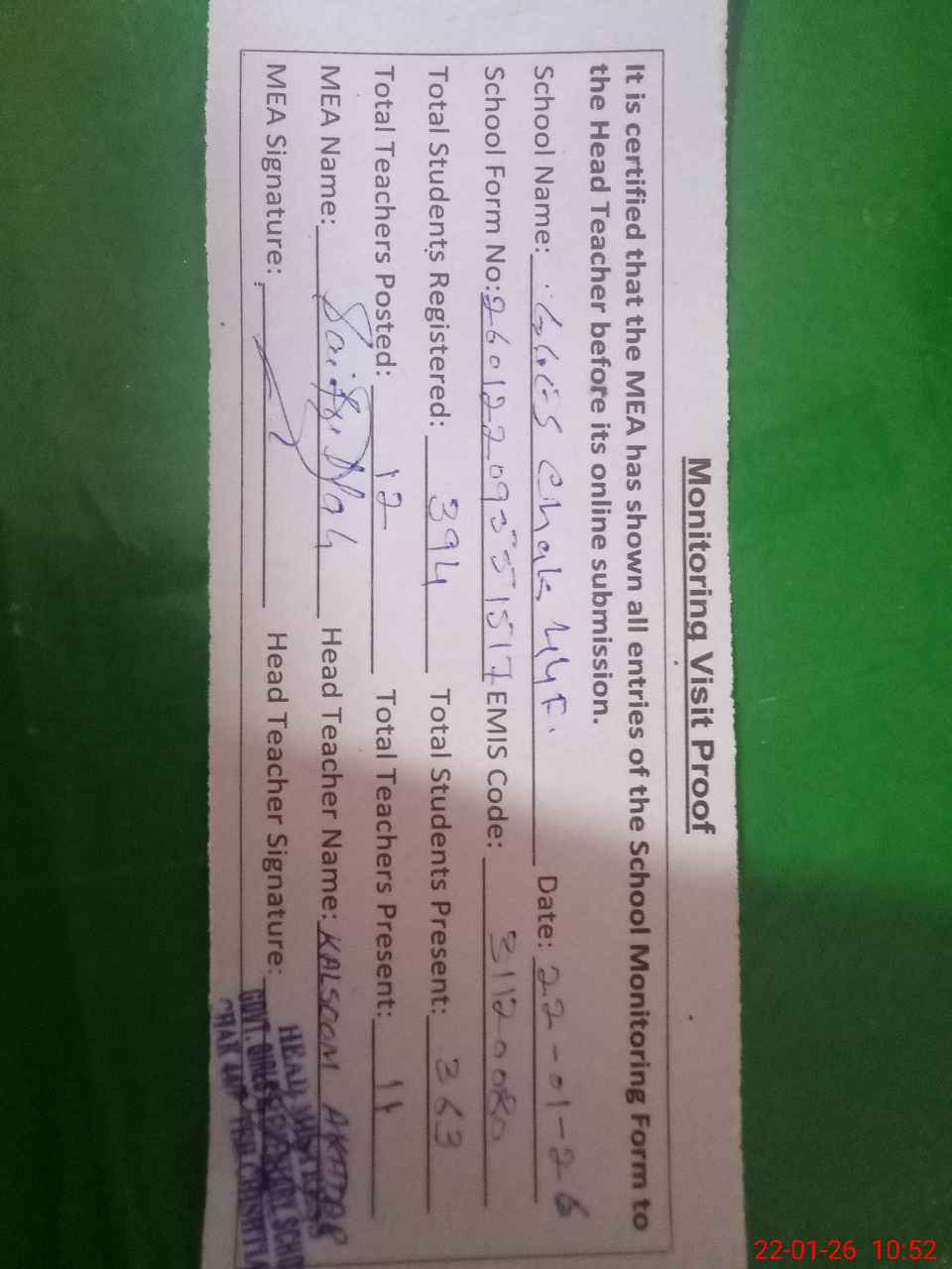 | Attendance Register | Head Teacher | MEA with School | Visit Proof |