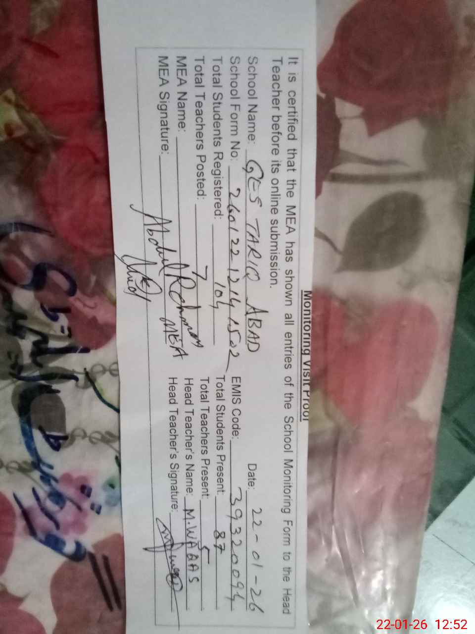 | EMIS Code: 39320094 | Name of School: GES TARIQ ABAD | |||