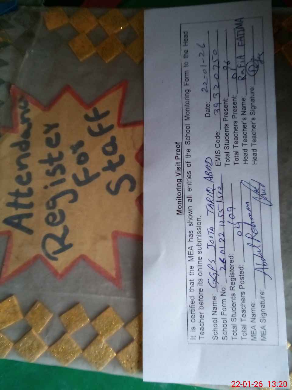 | Attendance Register | Head Teacher | MEA with School | Visit Proof |
