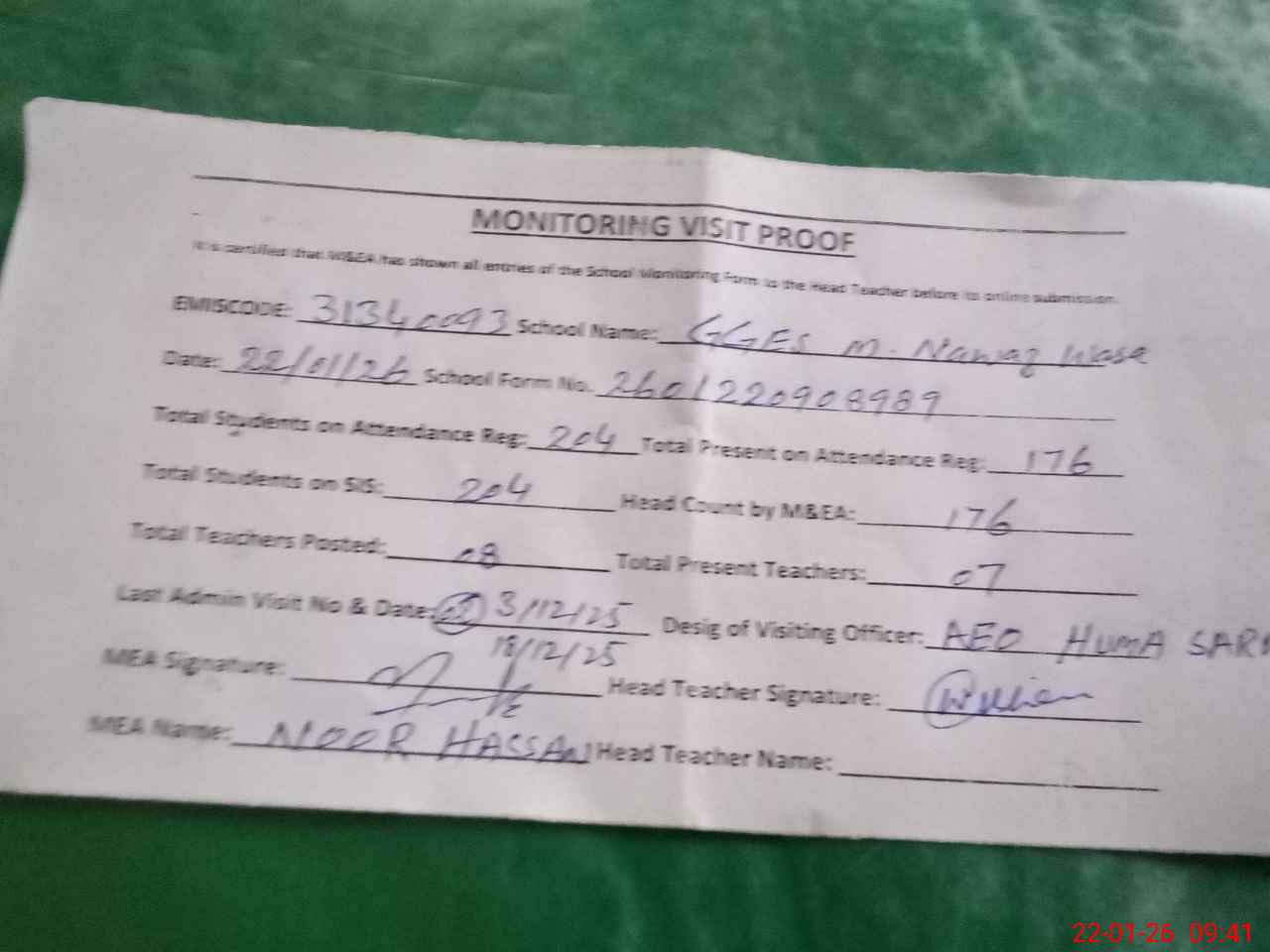 | Attendance Register | Head Teacher | MEA with School | Visit Proof |