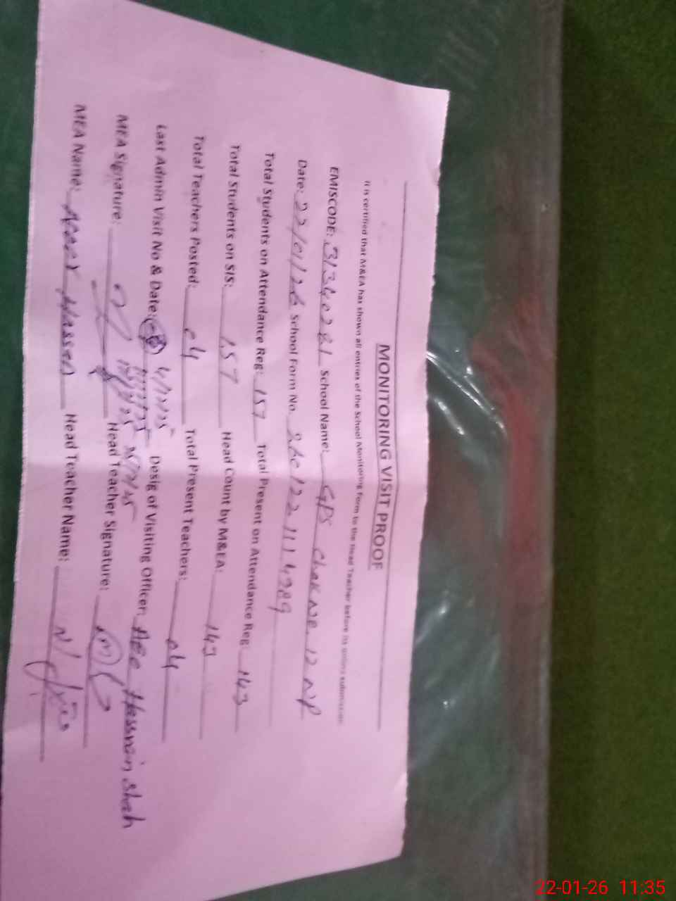 | Attendance Register | Head Teacher | MEA with School | Visit Proof |