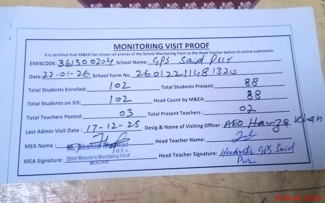 | EMIS Code: 36130204 | Name of School: GPS SAID PUR MULTAN P/O TATAY PUR MULTAN | |||