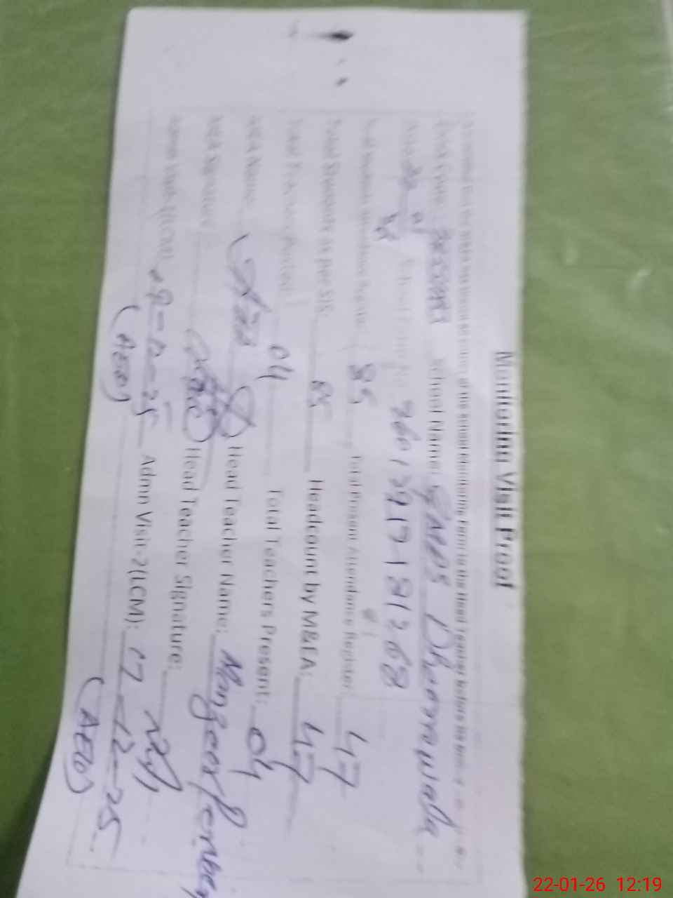 | Attendance Register | Head Teacher | MEA with School | Visit Proof |