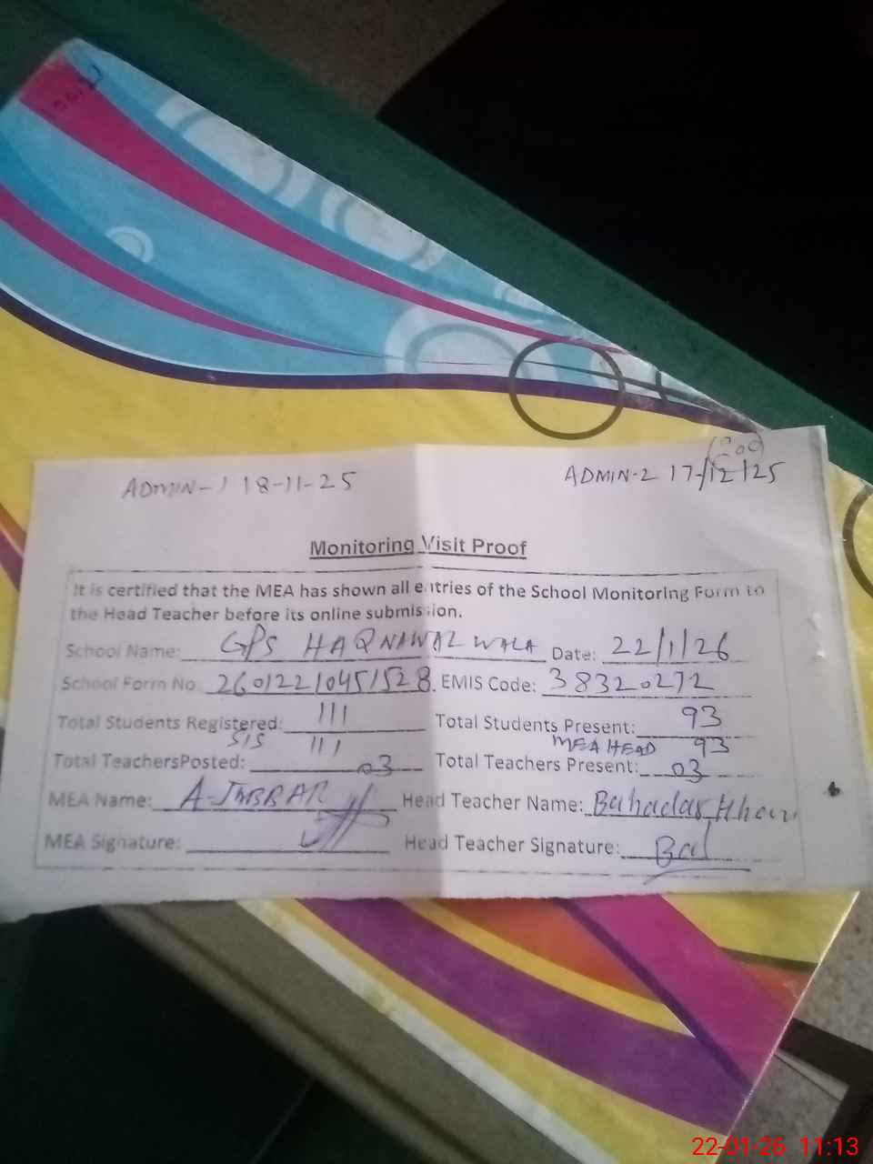 | Attendance Register | Head Teacher | MEA with School | Visit Proof |