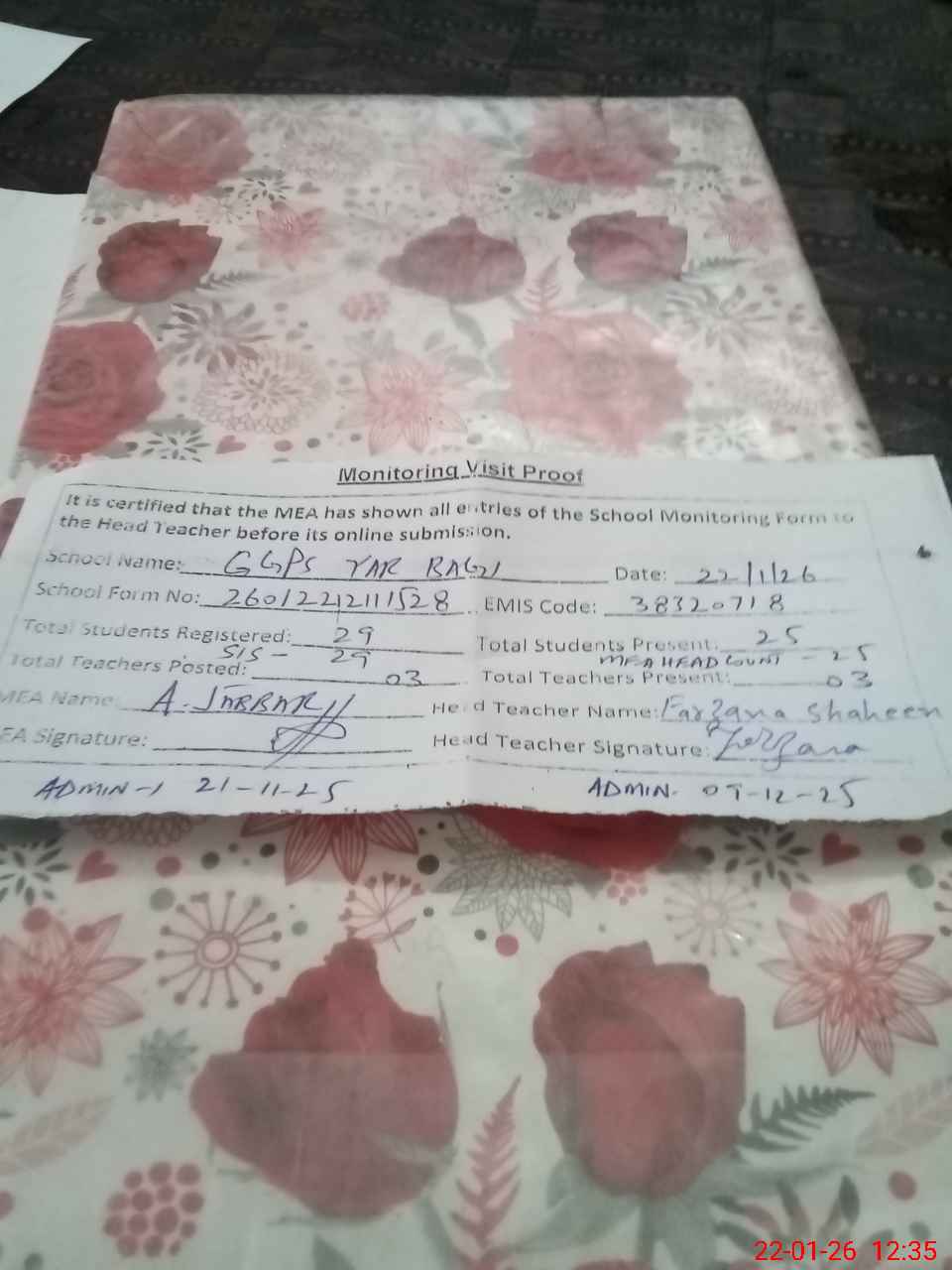 | Attendance Register | Head Teacher | MEA with School | Visit Proof |