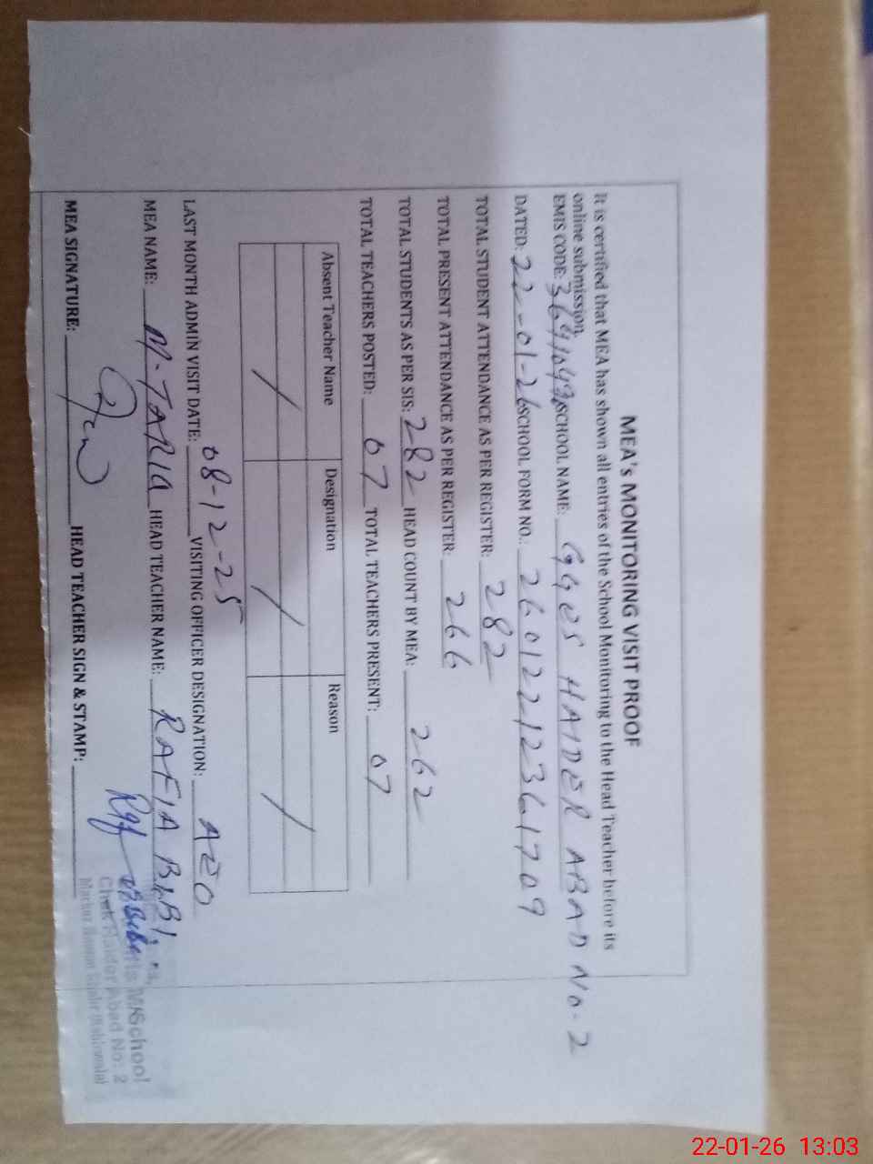 | Attendance Register | Head Teacher | MEA with School | Visit Proof |