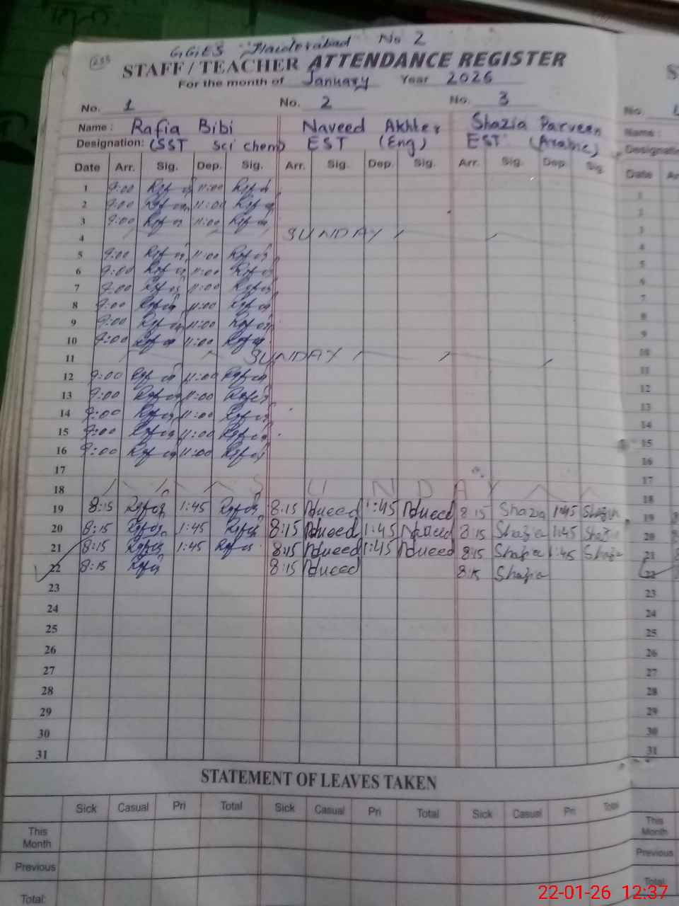 | CNIC | Full Name | Designation | R/C | Absence During Last Calender Month |