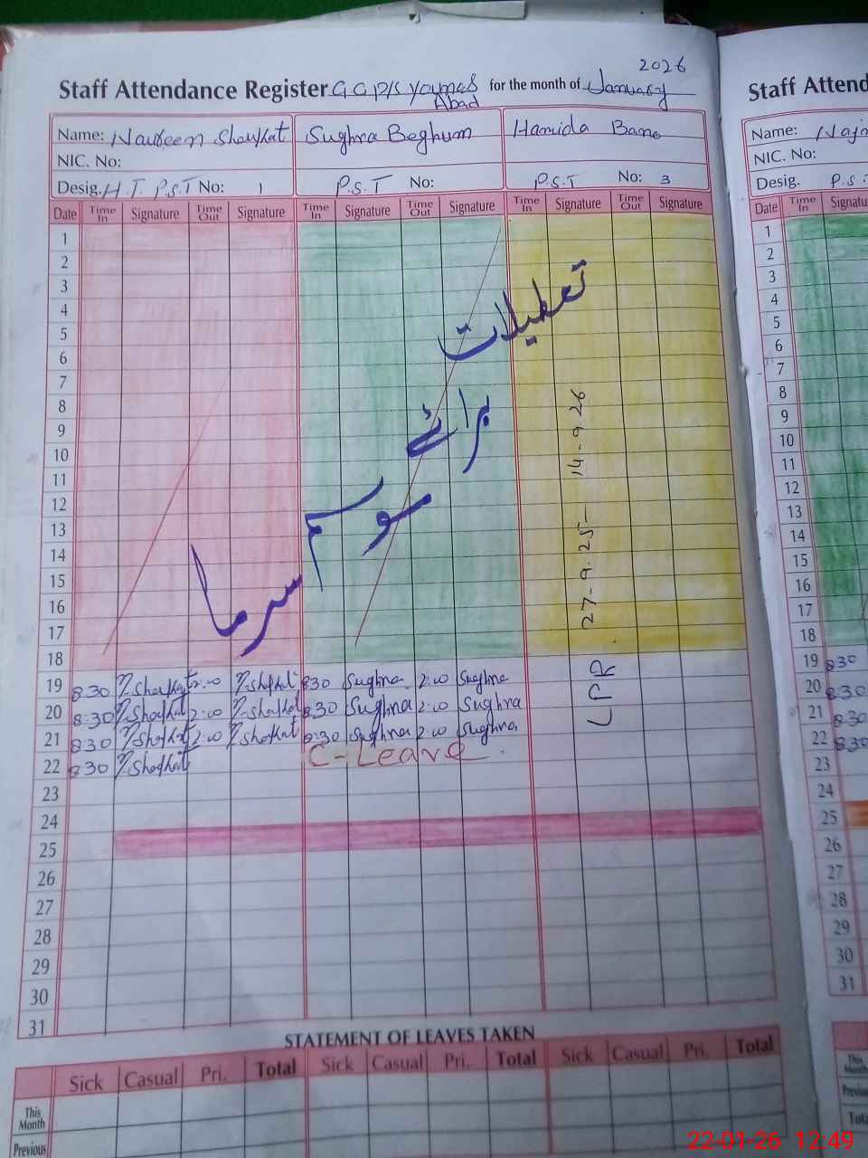 | CNIC | Full Name | Designation | R/C | Absence During Last Calender Month |