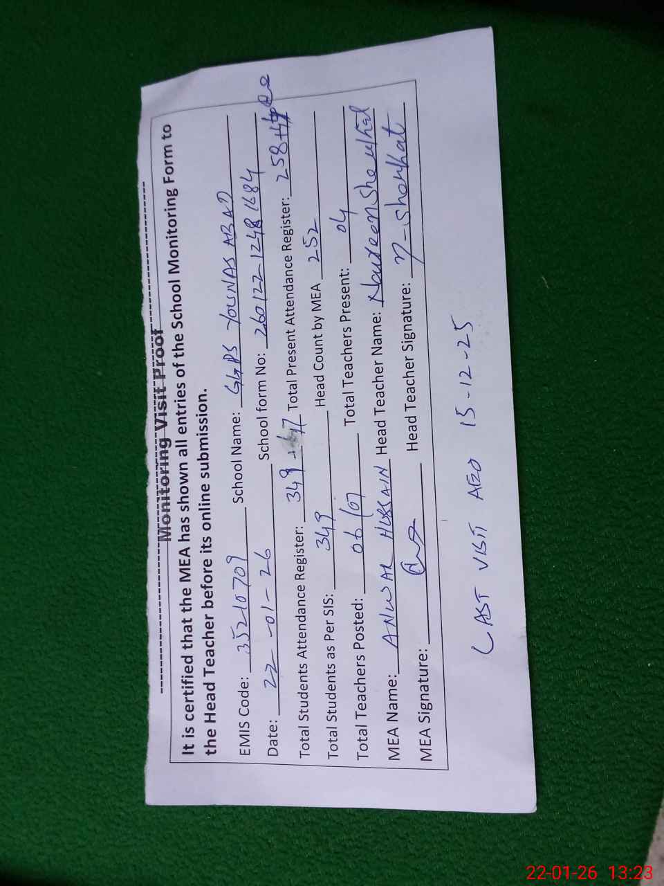 | Attendance Register | Head Teacher | MEA with School | Visit Proof |