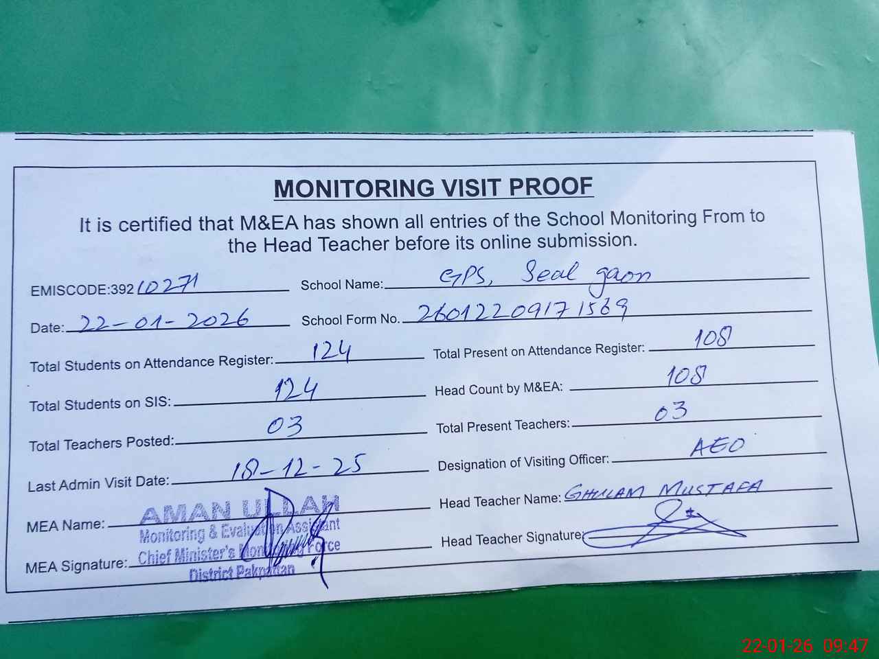 | Attendance Register | Head Teacher | MEA with School | Visit Proof |