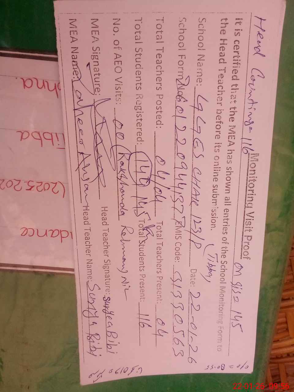 | Attendance Register | Head Teacher | MEA with School | Visit Proof |