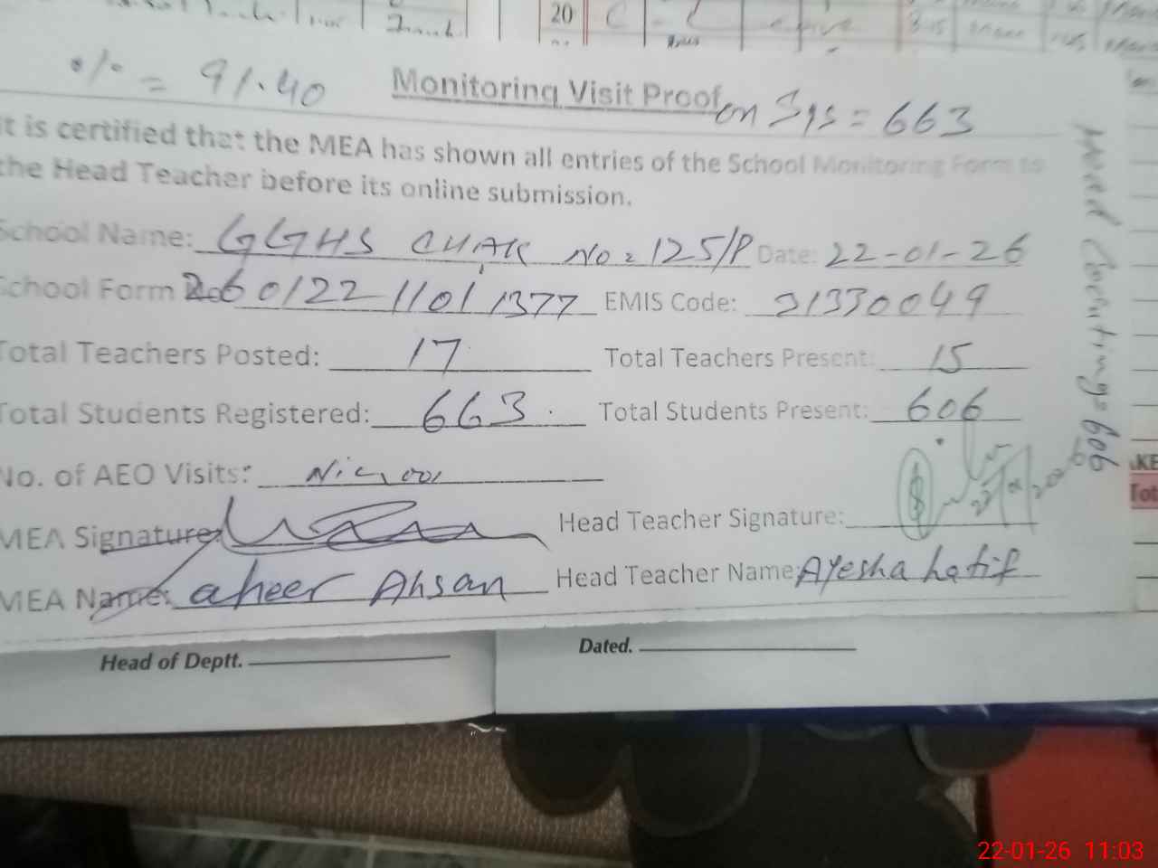 | Attendance Register | Head Teacher | MEA with School | Visit Proof |