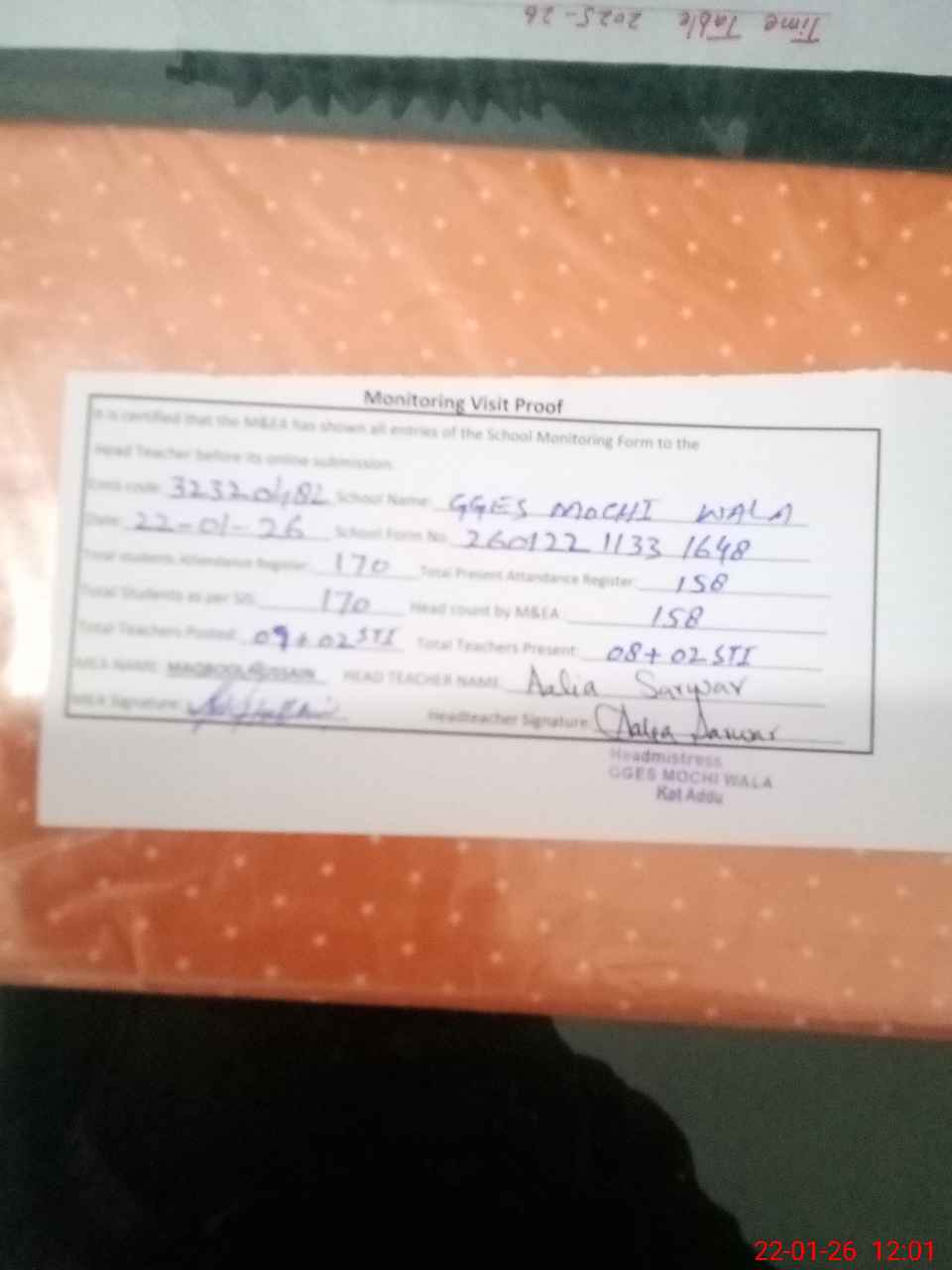 | Attendance Register | Head Teacher | MEA with School | Visit Proof |