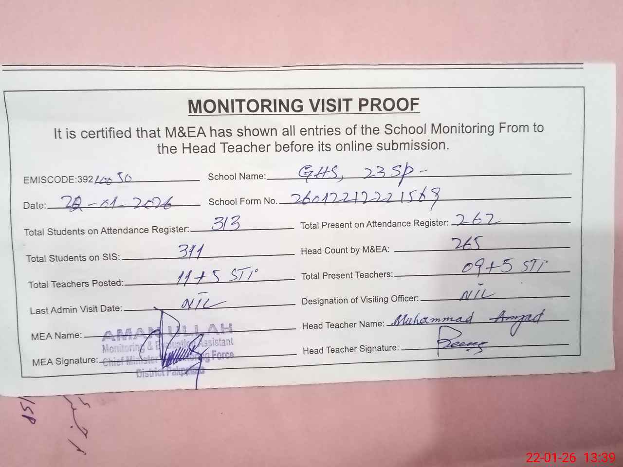 | Attendance Register | Head Teacher | MEA with School | Visit Proof |