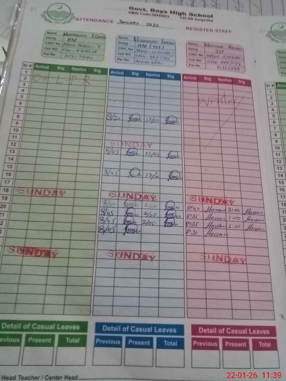 | CNIC | Full Name | Designation | R/C | Absence during last cal. month |