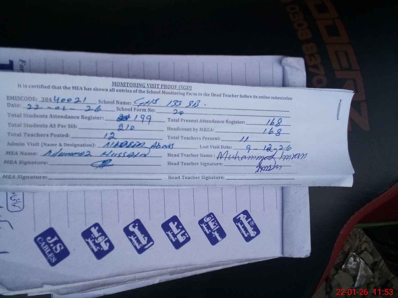 | Attendance Register | Head Teacher | MEA with School | Visit Proof |