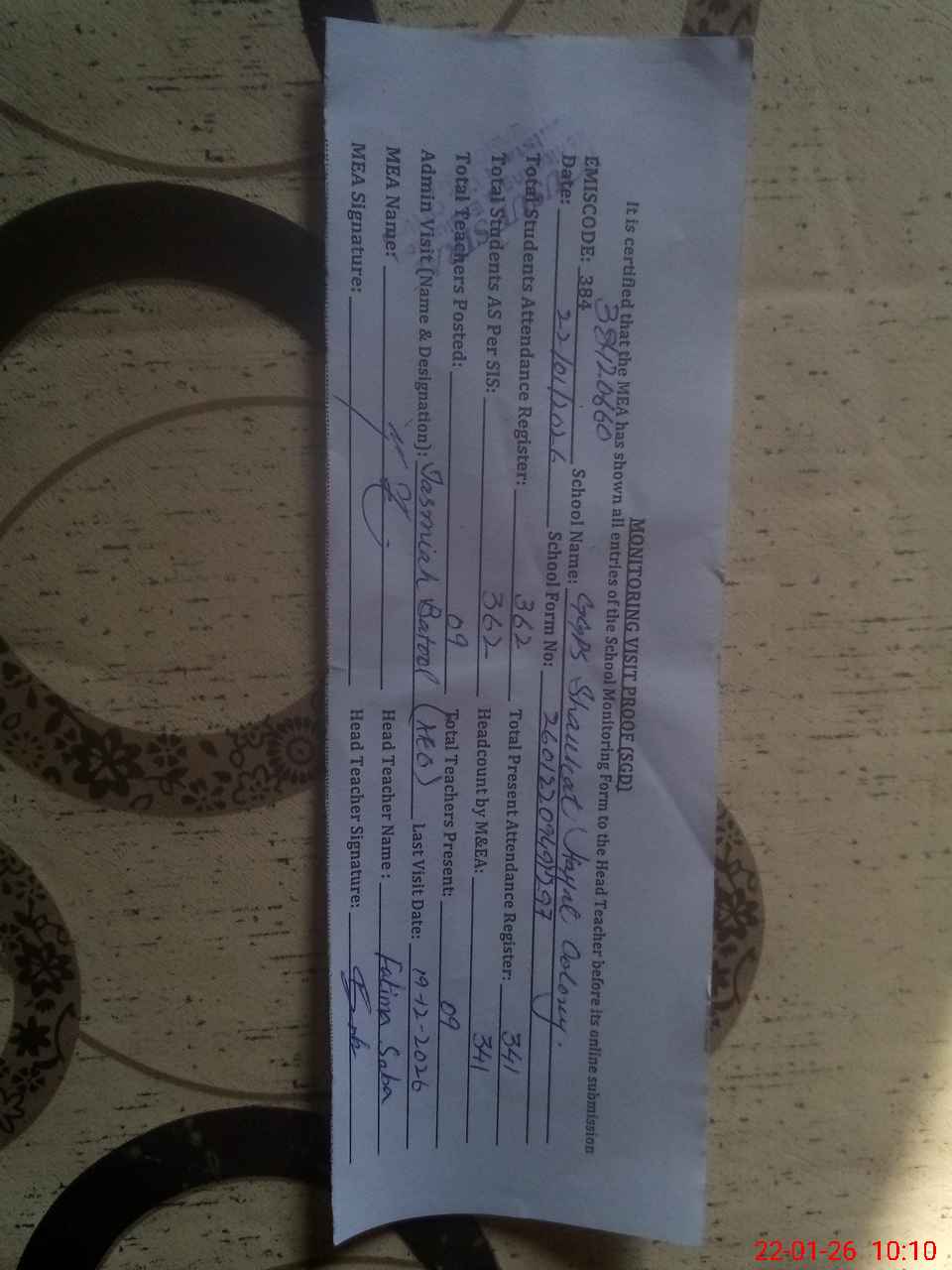 | Attendance Register | Head Teacher | MEA with School | Visit Proof |