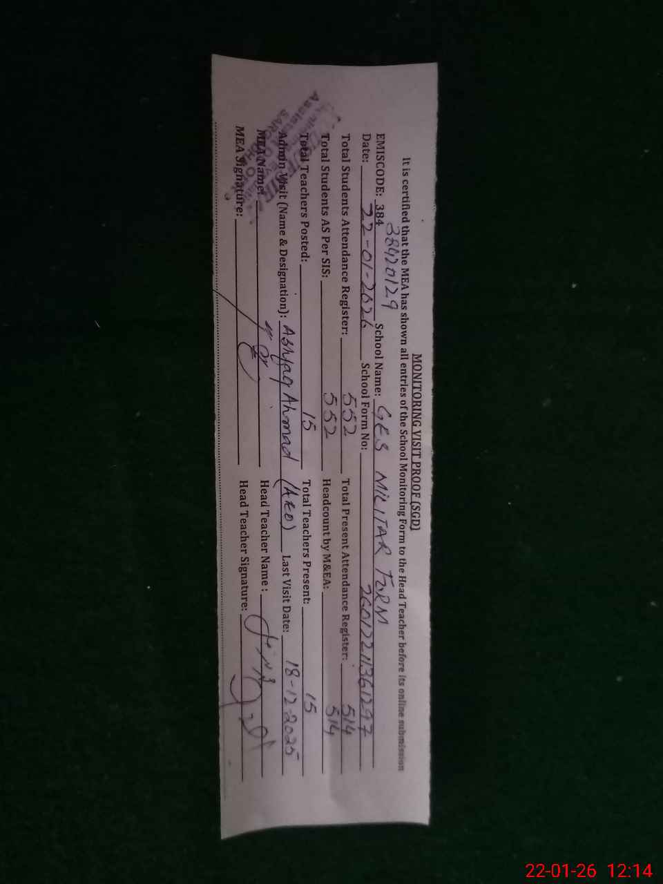 | Attendance Register | Head Teacher | MEA with School | Visit Proof |