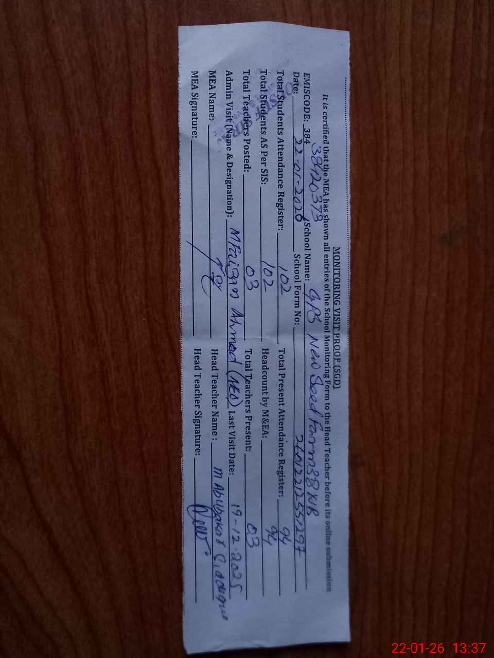 | Attendance Register | Head Teacher | MEA with School | Visit Proof |
