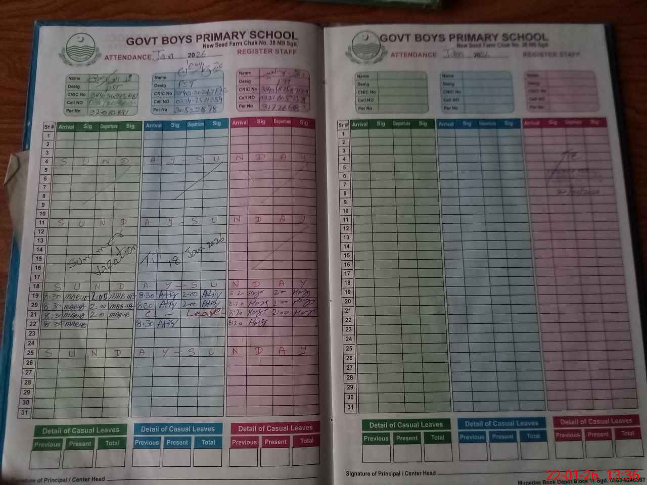 | CNIC | Full Name | Designation | R/C | Absence during last cal. month |