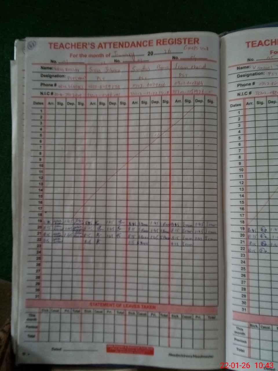 | CNIC | Full Name | Designation | R/C | Absence During Last Calender Month |