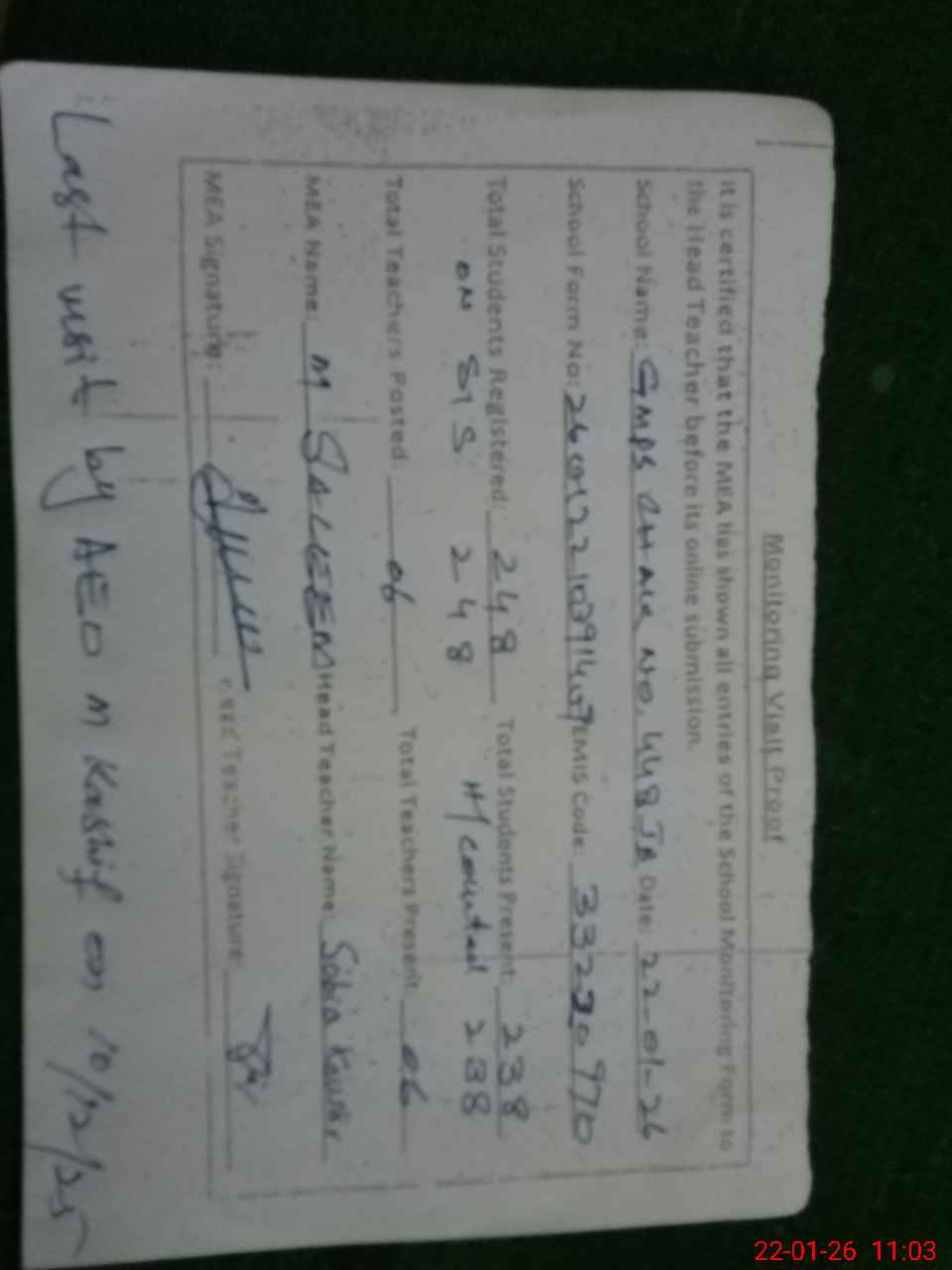 | Certified that this School was Inspected by the Undersigned MEA/DMO Today and the Information Stated Above is as Per Record. | |||||