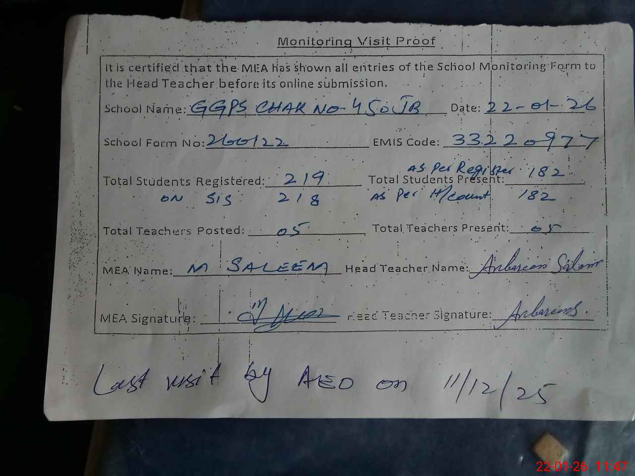 | Attendance Register | Head Teacher | MEA with School | Visit Proof |