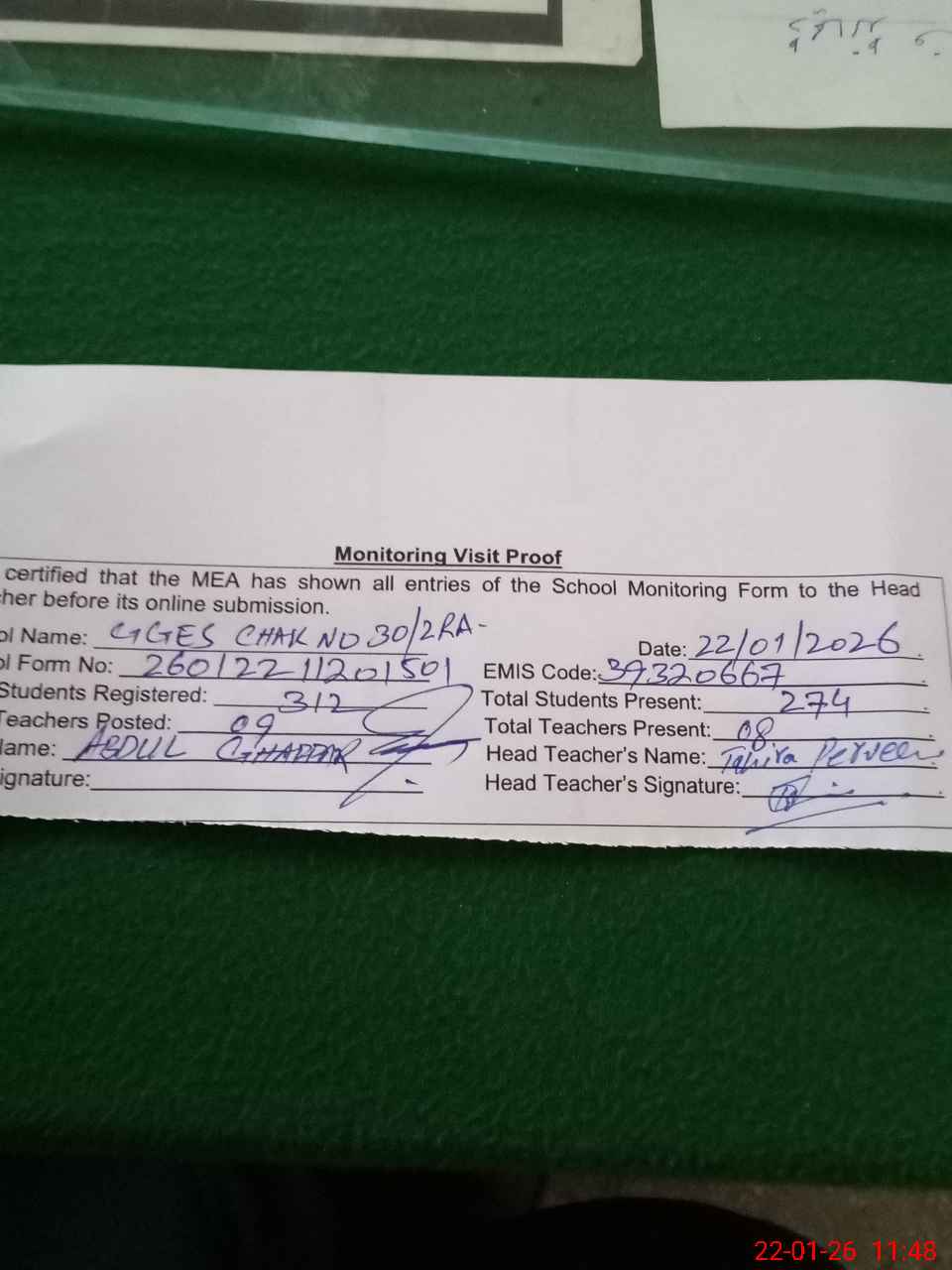 | EMIS Code: 39320667 | Name of School: GGES CHAK NO.30/2-RA | |||