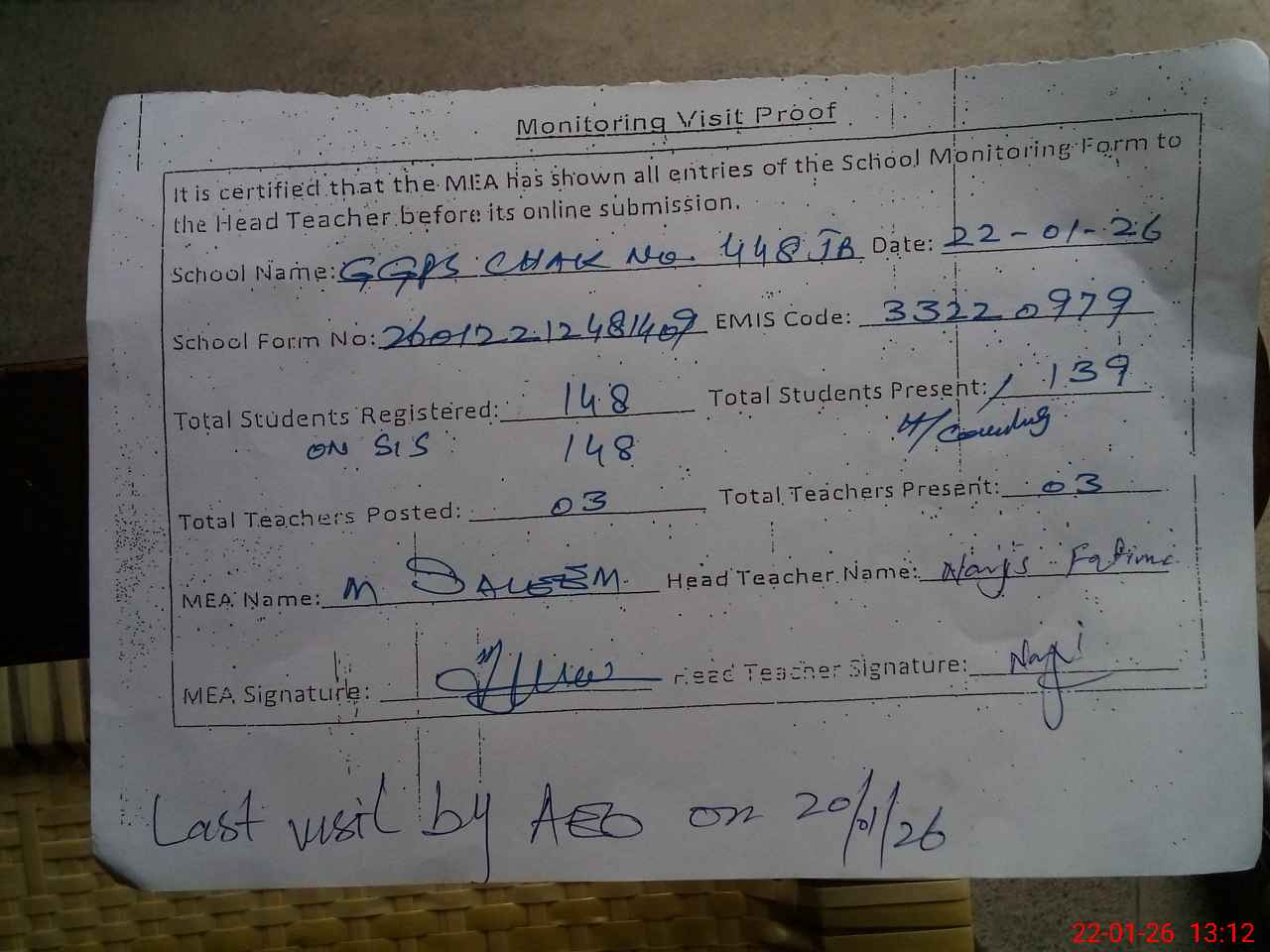 | EMIS Code: 33220979 | Name of School: GGPS CHAK NO 448 JB II | |||