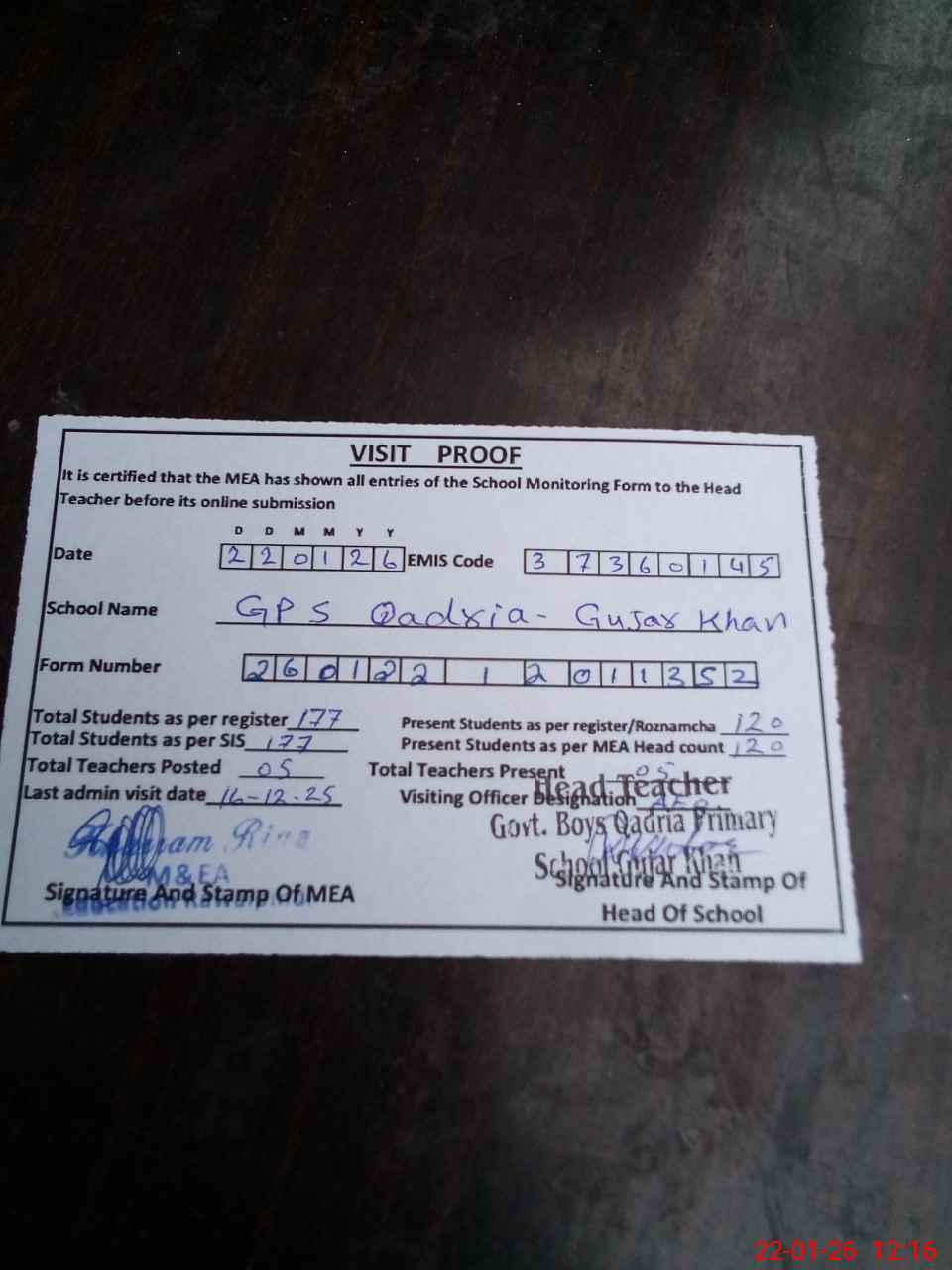 | EMIS Code: 37360145 | Name of School: GPS QADRIA | |||