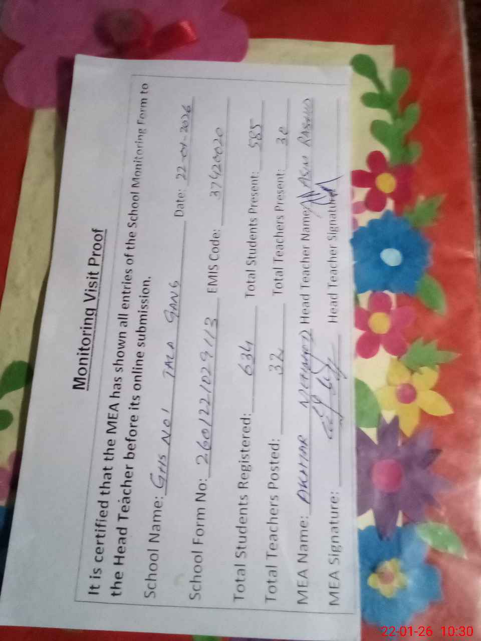 | Attendance Register | Head Teacher | MEA with School | Visit Proof |