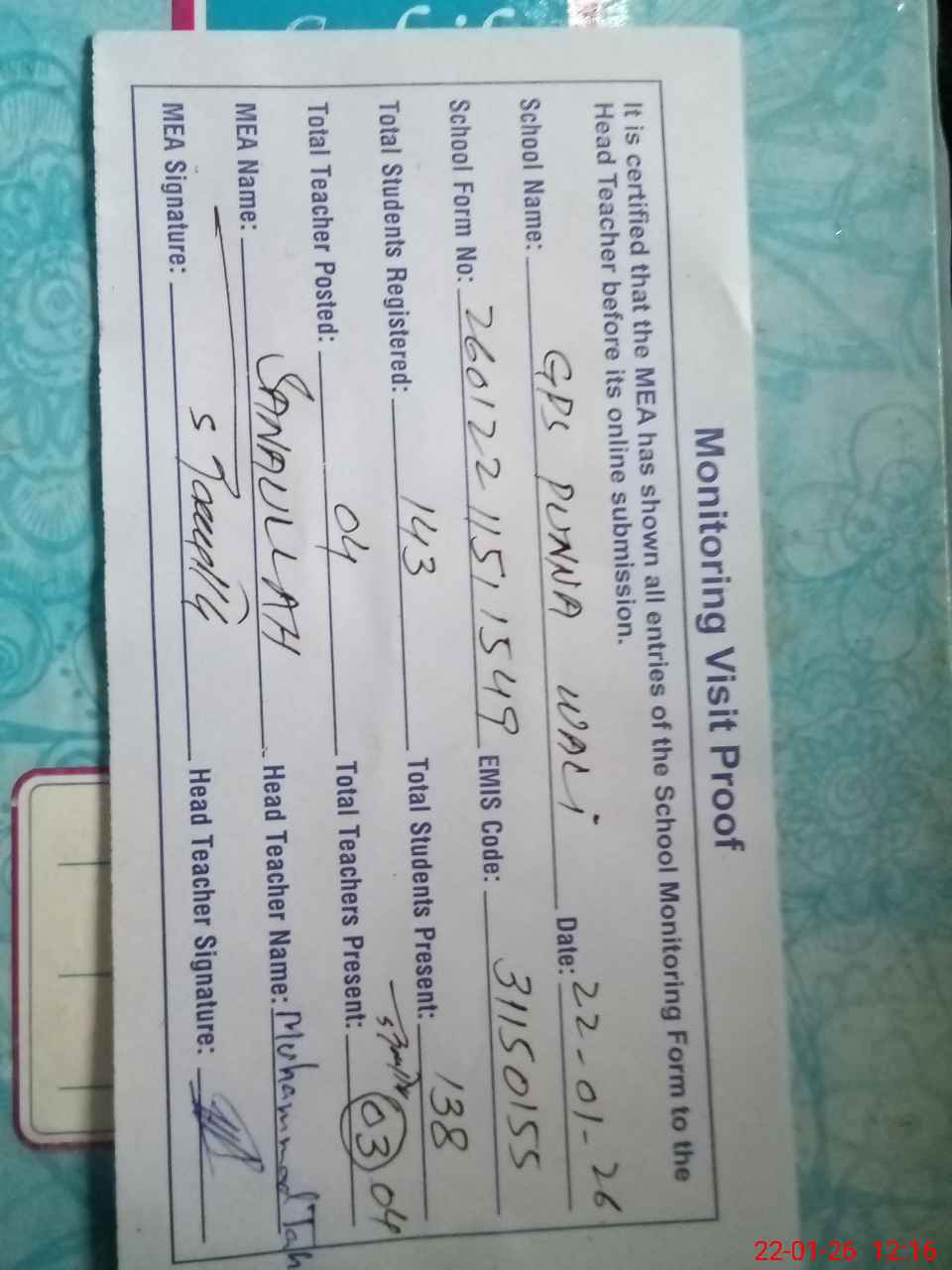 | EMIS Code: 31150155 | Name of School: GPS PUNA WALI | |||