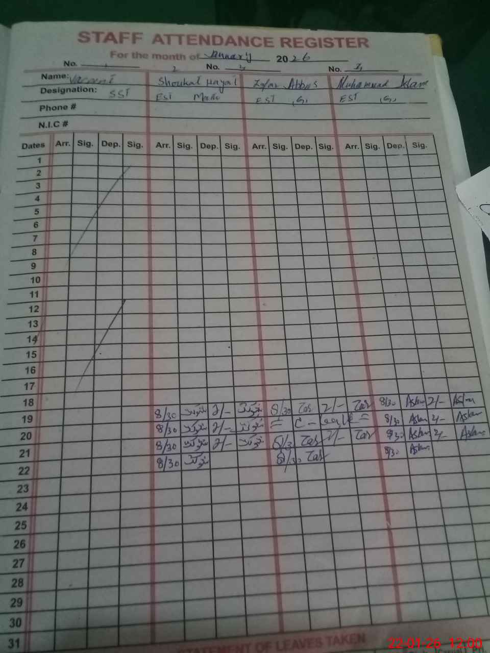 | CNIC | Full Name | Designation | R/C | Absence during last cal. month |