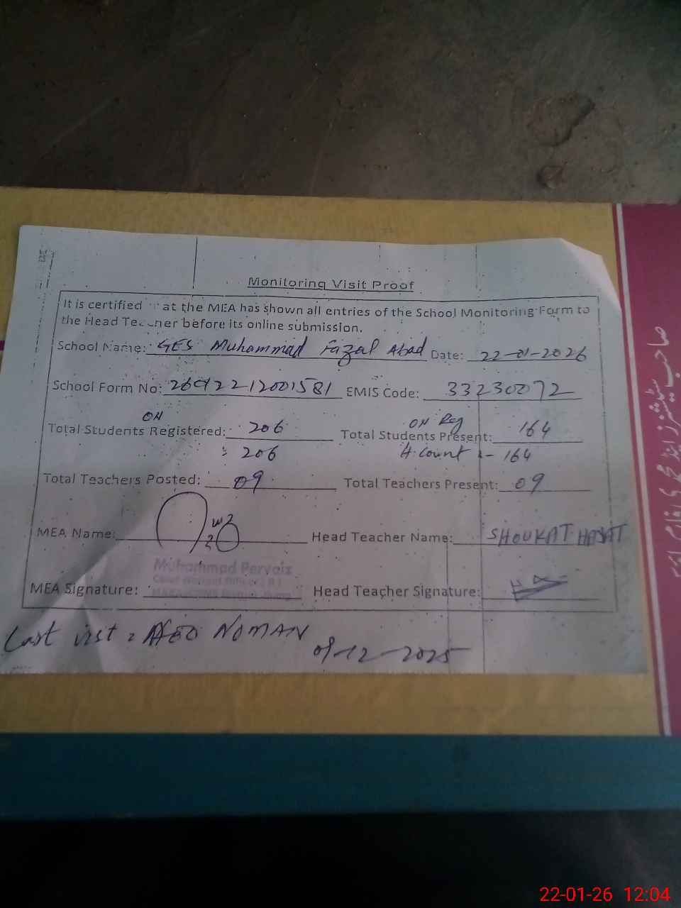 | Attendance Register | Head Teacher | MEA with School | Visit Proof |