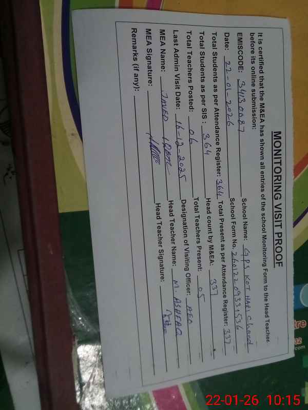 | EMIS Code: 34130087 | Name of School: GPS KOT HARI CHAND | |||