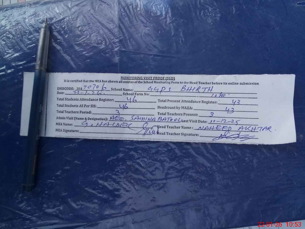 | Attendance Register | Head Teacher | MEA with School | Visit Proof |
