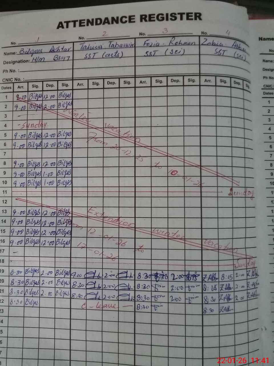 | CNIC | Full Name | Designation | R/C | Absence During Last Calender Month |