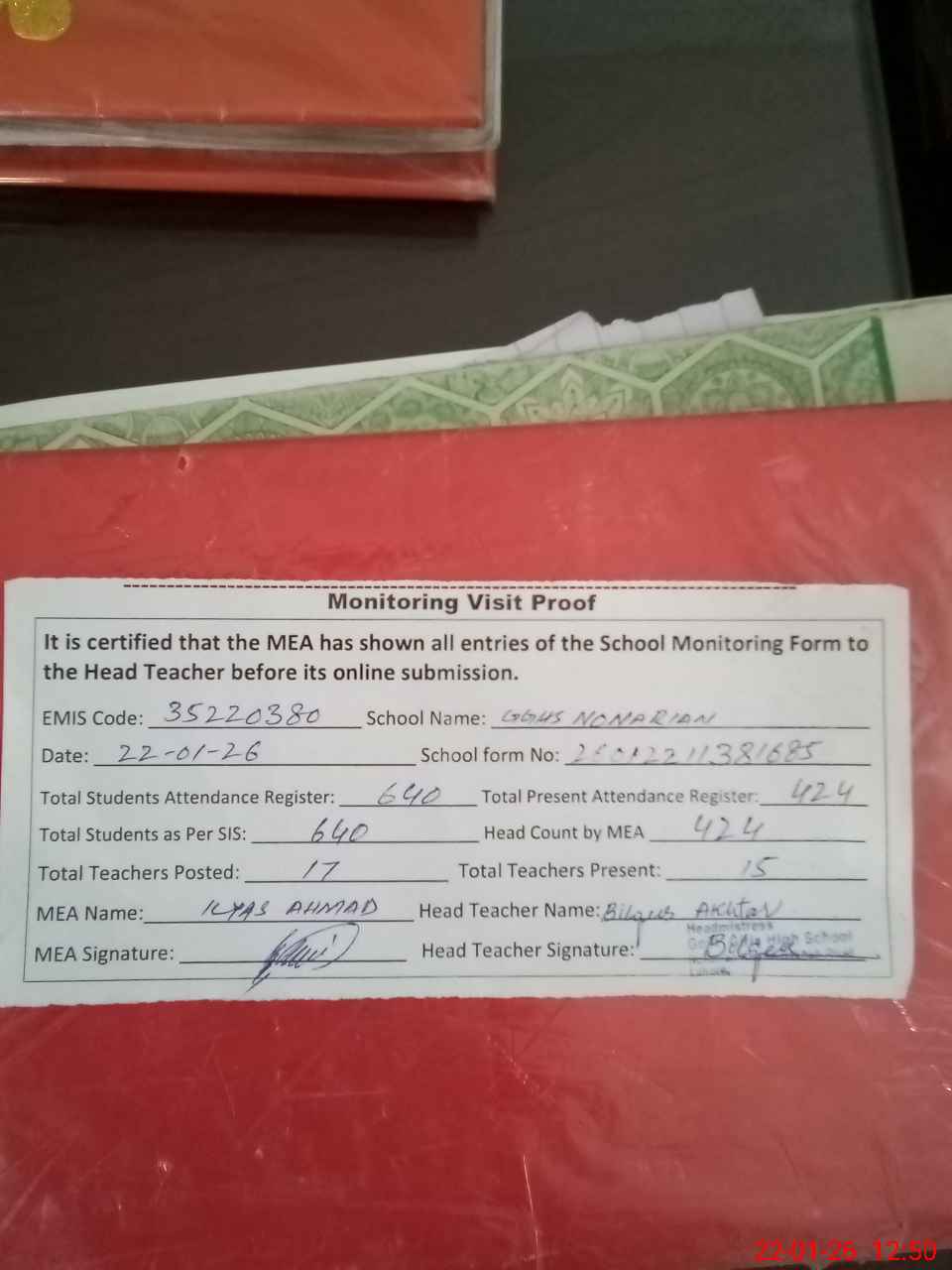 | Attendance Register | Head Teacher | MEA with School | Visit Proof |