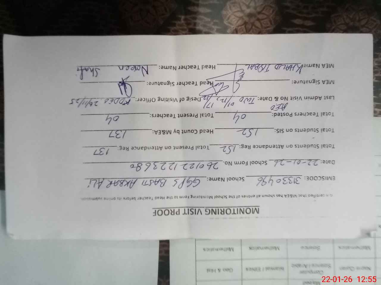 | Attendance Register | Head Teacher | MEA with School | Visit Proof |