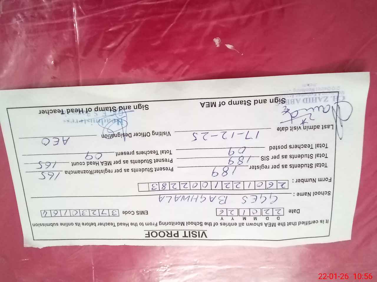 | Attendance Register | Head Teacher | MEA with School | Visit Proof |