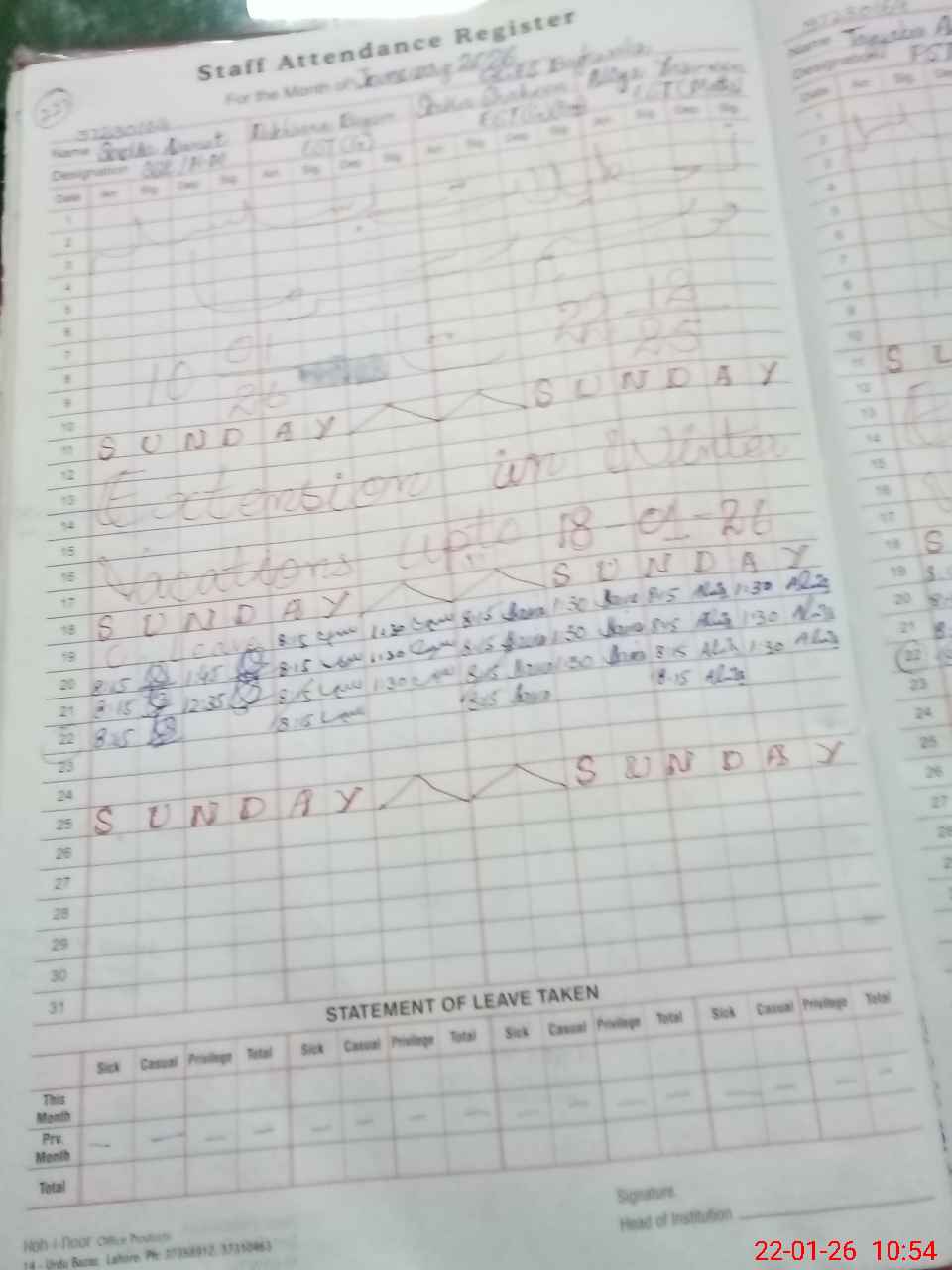 | CNIC | Full Name | Designation | R/C | Absence During Last Calender Month |
