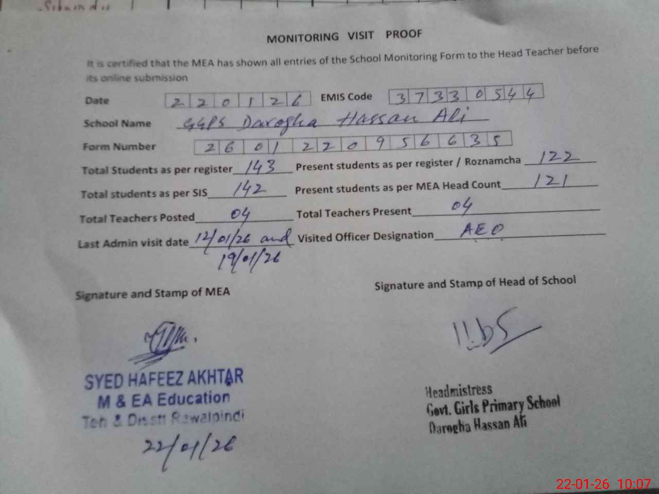 | Attendance Register | Head Teacher | MEA with School | Visit Proof |