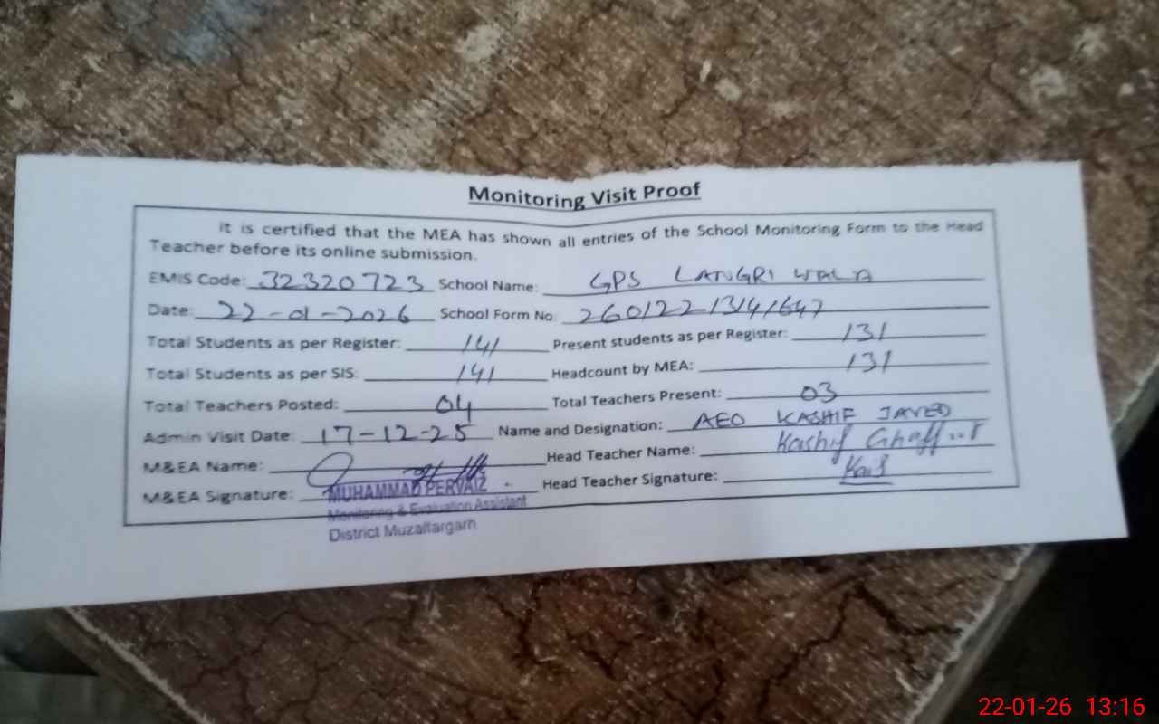 | EMIS Code: 32320723 | Name of School: GPS LANGRI WALA | |||