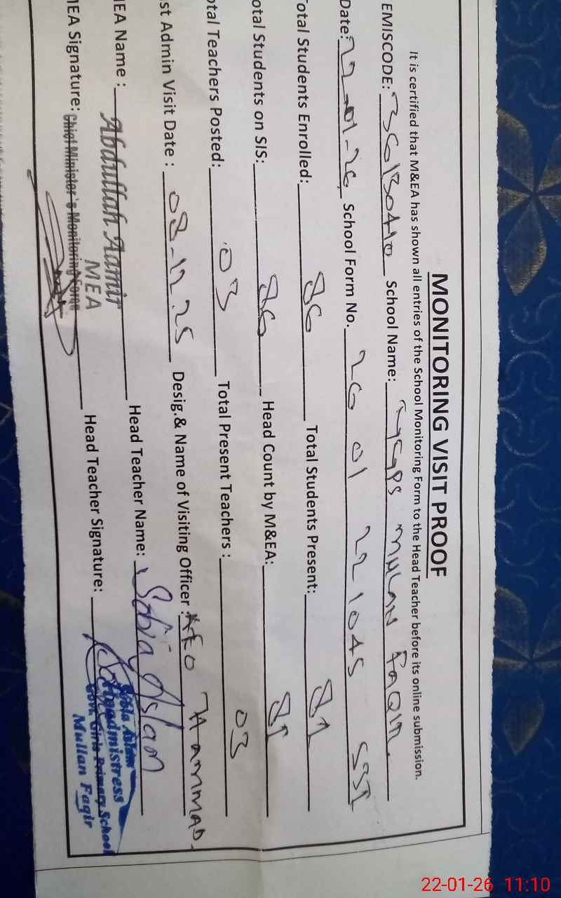 | EMIS Code: 36130410 | Name of School: GGPS MULAN FAQIR MULTAN | |||