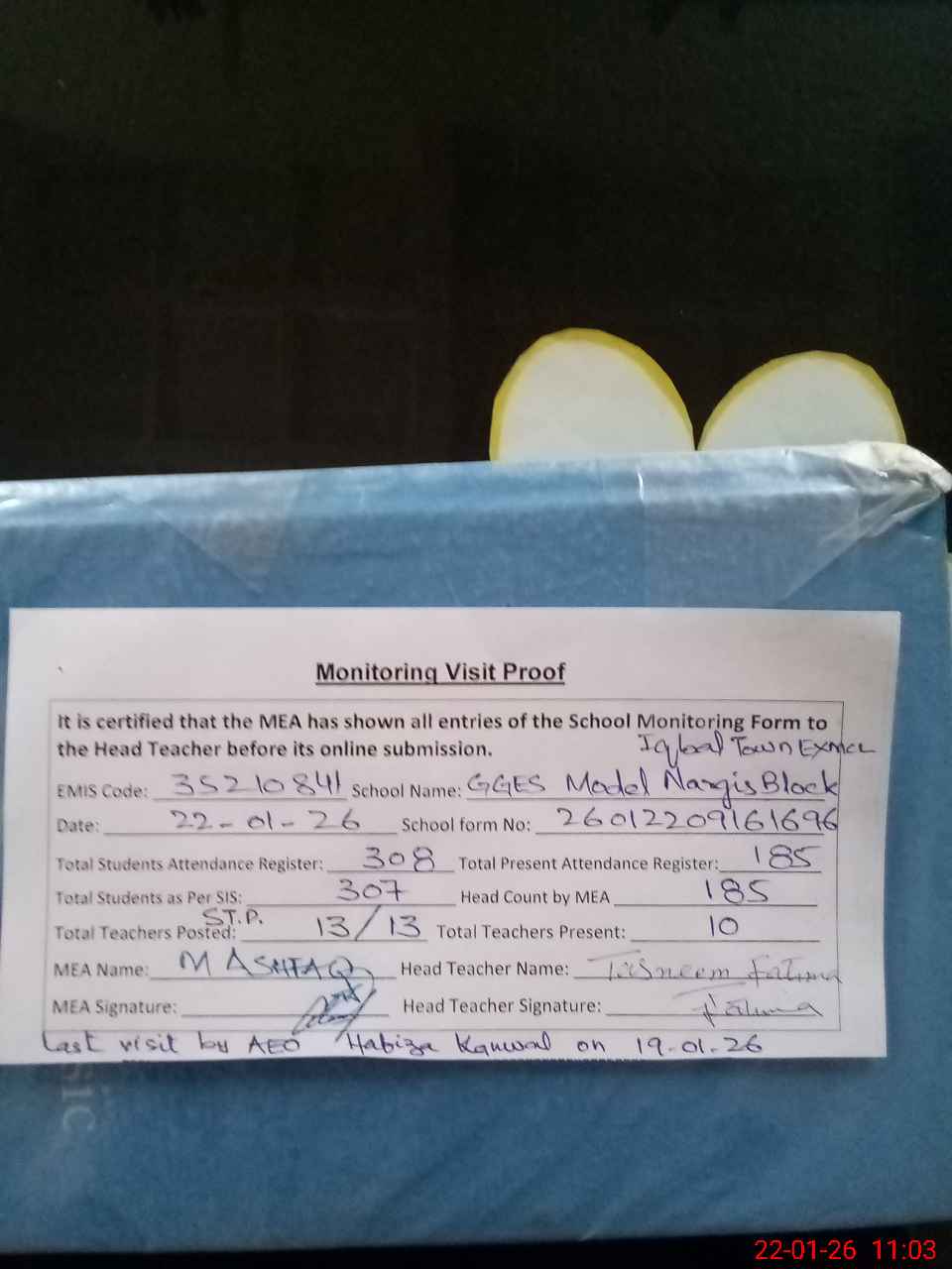 | EMIS Code: 35210841 | Name of School: GGES MODEL NARGIS BLOCK IQBAL TOWN (EX-MCL) | |||