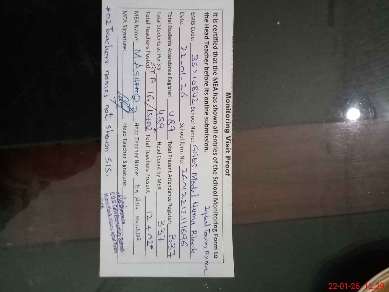 | Attendance Register | Head Teacher | MEA with School | Visit Proof |