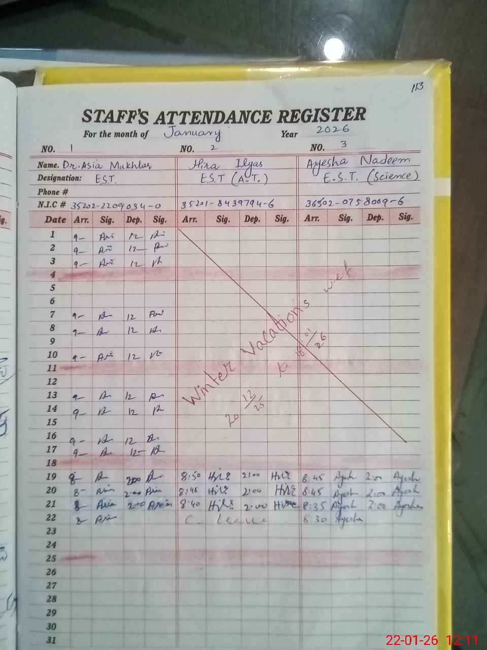 | Remarks (Use Separate Page if Required): EST Dr Asia Mukhtar and EST Saryya Anwar names not shown on SIS Security Guard Muhammad Tufail attached here and present today AEO Hafiza Kanwal last visited on 19-01-26 35210842 | |||||