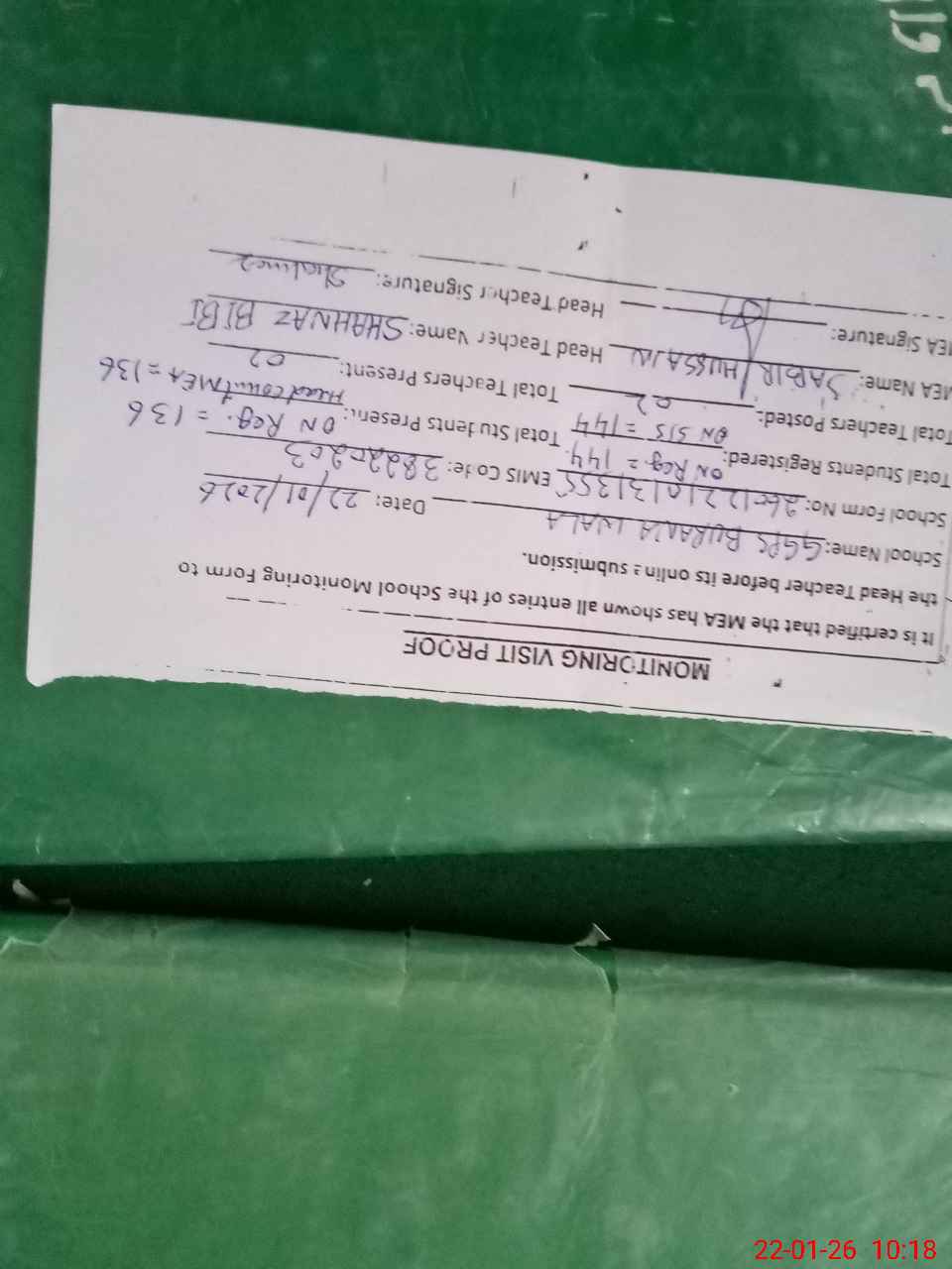 | Remarks (Use Separate Page if Required): no teacher absent total students on register 144 total students on SiS 144 last admin visit by AEO on 11 Dec 2025 | |||||