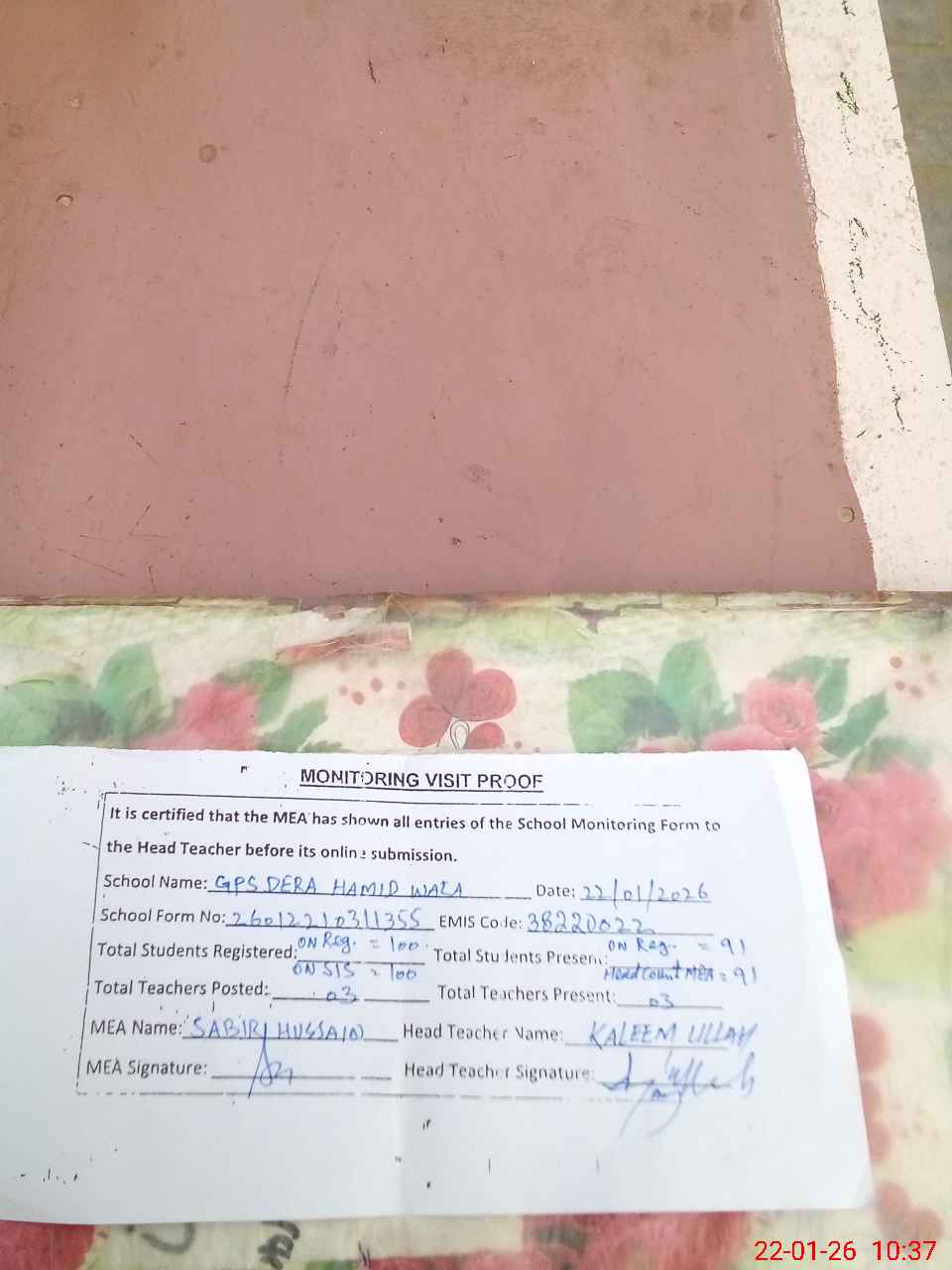 | Remarks (Use Separate Page if Required): no teacher absent total students on register 100 total students on SiS 100 last admin visit by DDEO on 14 Oct 2025 | |||||