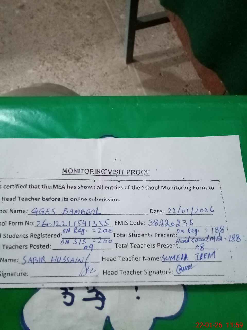 | Remarks (Use Separate Page if Required): no teacher absent total students on register 200 total students on SiS 200 last admin visit by DEO on 19 Dec 20025 | |||||